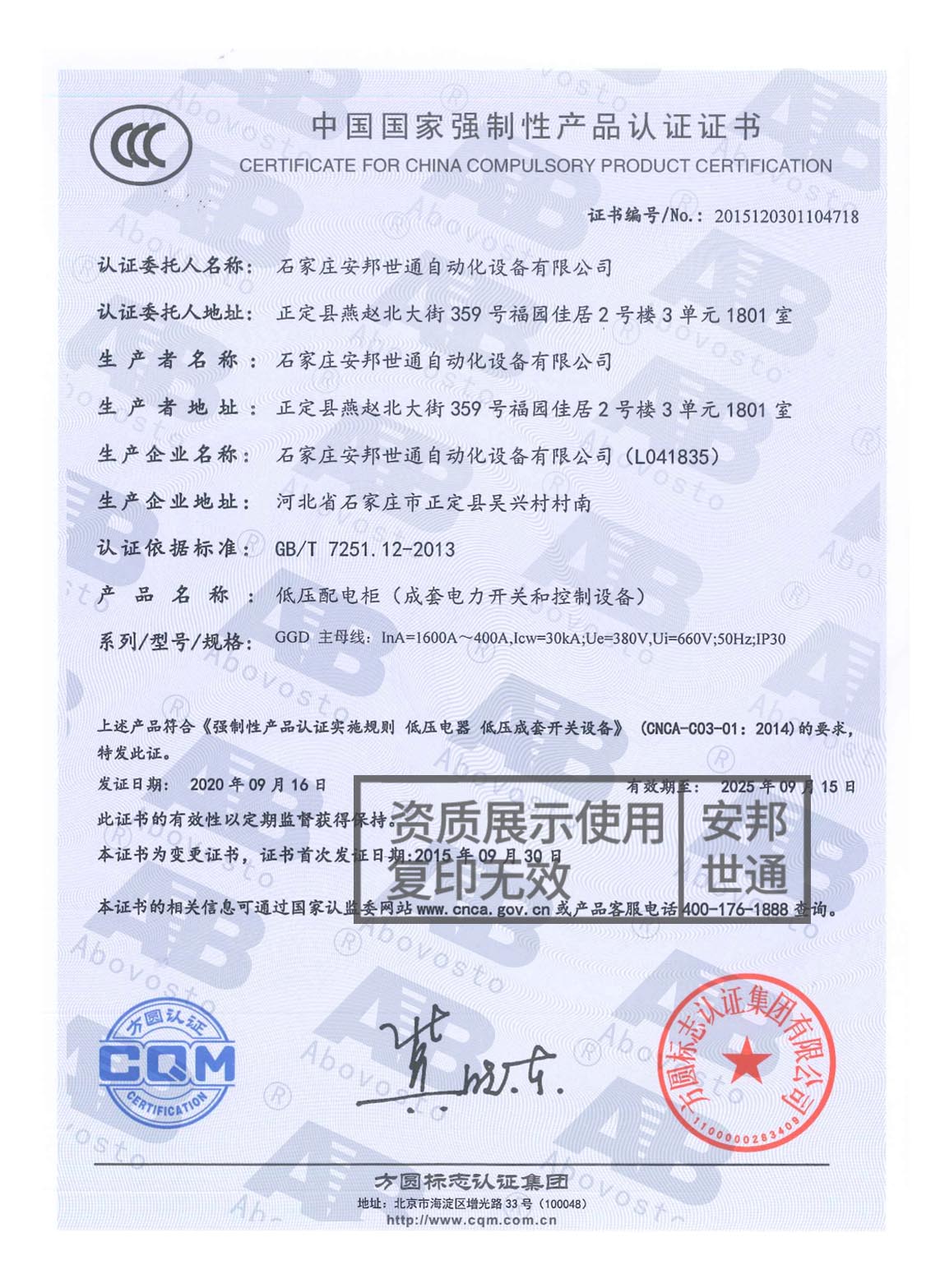 低压配电柜-3C认证证书